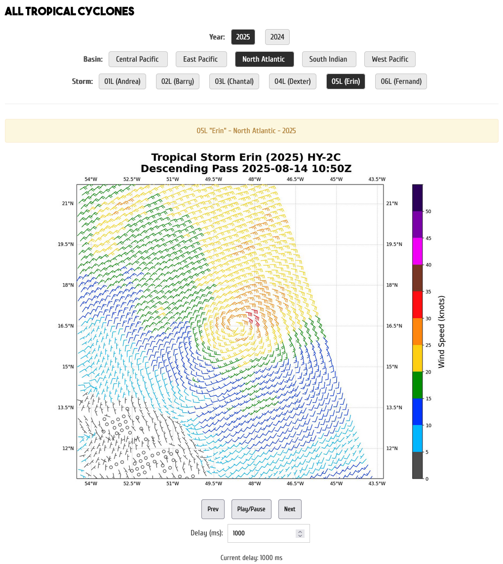 Using data from 5 wind satellites (ASCAT-B, ASCAT-C, OSCAT-3, HY-2B, and HY-2C) plots are generated of tropical cyclone wind speed over its lifetime in the ocean.
